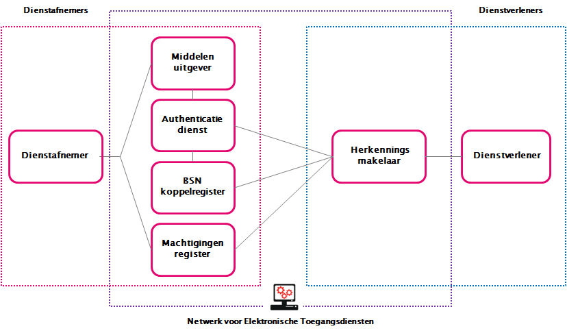 De kosten voor verplichte functionaliteit worden gedeeld tussen de twee primaire doelgroepen van het Netwerk (voor Elektronische Toegangsdiensten): bedrijven en dienstverleners. De dienstverlener betaalt voor de dienstverlening van de Herkenningsmakelaar, terwijl de bedrijven betalen voor de dienstverlening door de Authenticatiedienst (AD) (inclusief Middel) en het Machtigingenregister (MR).
