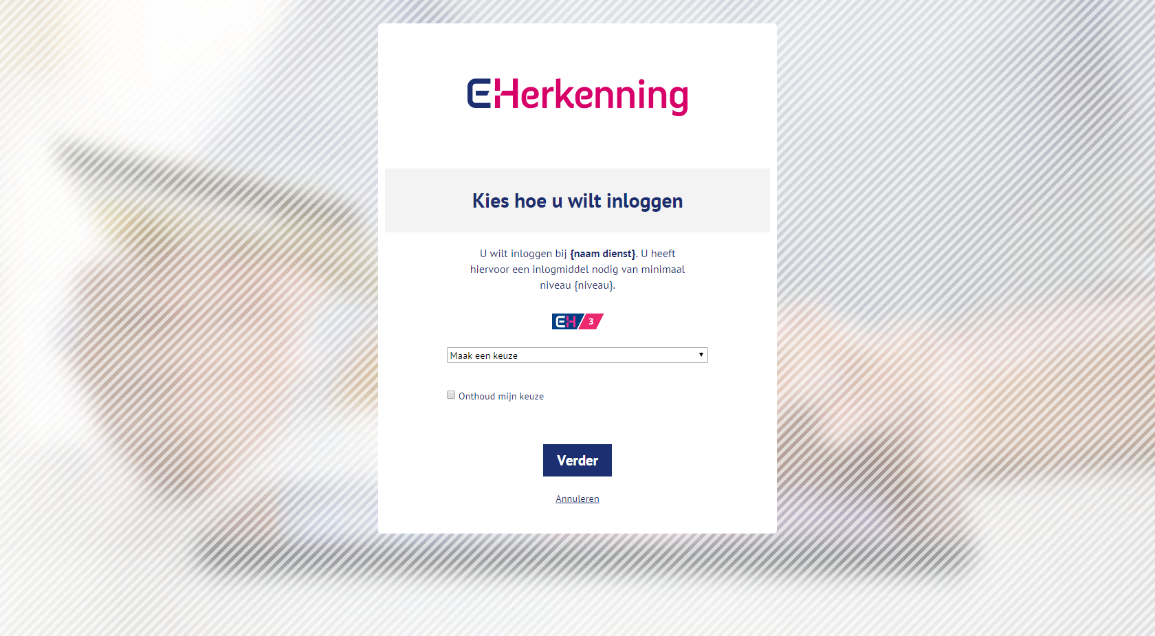 Op het scherm van de Herkenningsmakelaar wordt vermeld wat het door de dienstverlener minimaal vereiste betrouwbaarheidsniveau is.