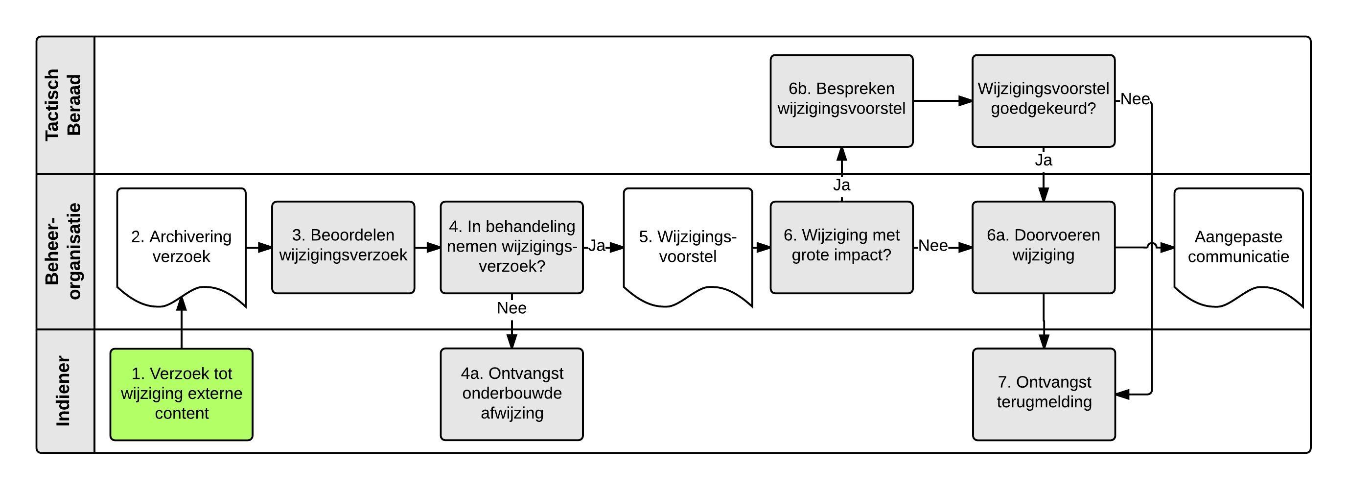 Activiteit | 5. Na een eerste beoordeling formuleert de beheerorganisatie een wijzigingsvoorstel dat in lijn is met het verzoek tot wijziging, het Afsprakenstelsel en de deelnemersovereenkomst. 6. De beheerorganisatie beoordeelt de impact van het opgestelde wijzigingsverzoek. Bij twijfel wordt het verzoek voorgelegd aan inhoudelijke experts uit de beheerorganisatie zodat zij het kunnen toetsen aan het Afsprakenstelsel. a. Bij een wijziging met kleine impact: