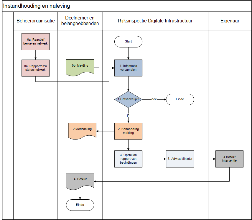 Activiteit | Een Deelnemer, de Beheerorganisatie, Dienstverlener of Dienstafnemer in het Afsprakenstelsel informeert de Toezichthouder via het Rijksinspectie Digitale Infrastructuur via een melding of klacht. Rijksinspectie Digitale Infrastructuur ontvangt de melding of klacht en toetst de ontvankelijkheid en communiceert de uitkomst aan de betrokken partij(-en). De Toezichthouder start uit eigen beweging een onderzoek. |