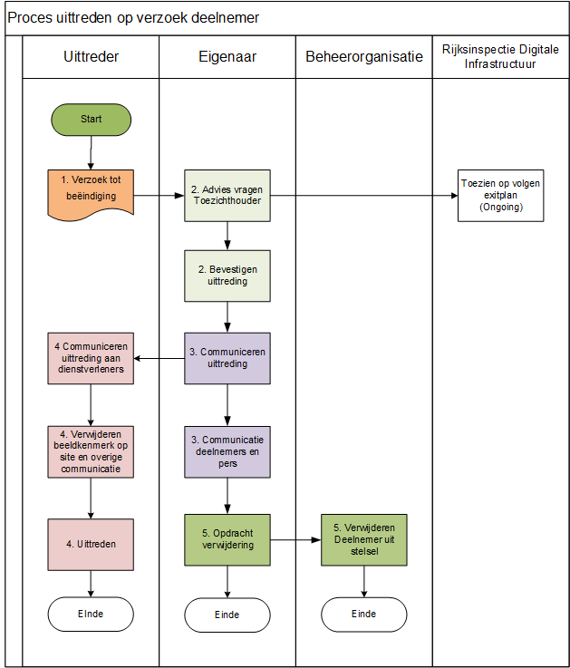 Activiteit | De deelnemers overeenkomst is tussen Deelnemer en Eigenaar. Beide partijen kunnen deze eenzijdig opzeggen. De Eigenaar ontvangt daarom het verzoek tot beëindiging. De Eigenaar vraagt advies aan de Rijksinspectie Digitale Infrastructuur inzake de uittreding. |