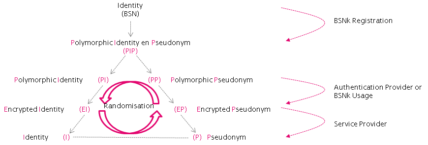 a cryptographic derivative of a root identifying attribute, such as the BSN | a Participant (MU/AD), | Encrypted Pseudonym | |